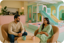The café overlooks the play zones, so you can keep an eye on your little one without missing a beat. Every detail, from the calming ambiance to our impeccable hygiene standards, is crafted to give you peace of mind. While they laugh, climb, and discover new adventures, you get to recharge in a space that feels just as special.